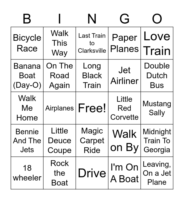 This bingo card has a free space and 38 words: Big Yellow Taxi, Fast Car, Drive My Car, On The Road Again, Midnight Train To Georgia, Little Deuce Coupe, Long Black Train, Midnight Train To Memphis, Love Train, Jet Airliner, Airplanes, Paper Planes, Leaving, On a Jet Plane, Mustang Sally, Banana Boat (Day-O), Bennie And The Jets, Car Wash, Last Train to Clarksville, Mercedes Benz, Little Red Corvette, Bicycle Race, Rock the Boat, Double Dutch Bus, 18 wheeler, Low Rider, Drive, Hot Rod Lincoln, Life is a Highway, Train, Train, Crazy Train, Learn to Fly, Magic Carpet Ride, I'm On A Boat, Walk This Way, Walking in Memphis, Walk on By, Walk Me Home and Chasing Cars.