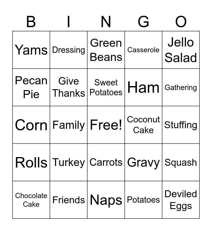 This bingo card has a free space and 24 words: Turkey, Friends, Sweet Potatoes, Chocolate Cake, Jello Salad, Yams, Pecan Pie, Dressing, Coconut Cake, Carrots, Ham, Corn, Gravy, Squash, Give Thanks, Potatoes, Stuffing, Green Beans, Gathering, Family, Deviled Eggs, Rolls, Casserole and Naps.