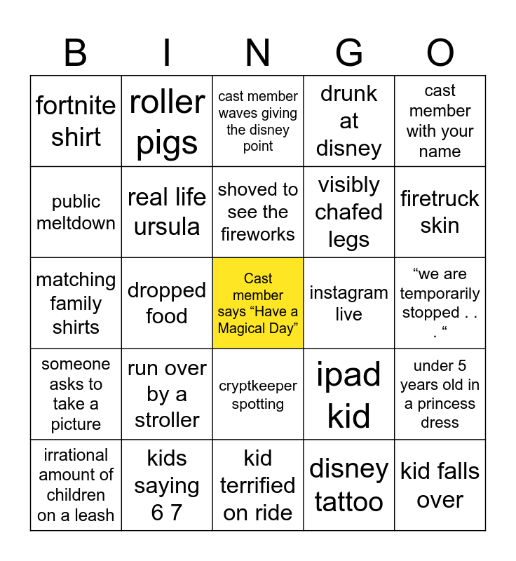 This bingo card has a free space and 24 words: run over by a stroller, kids saying 6 7, shoved to see the fireworks, irrational amount of children on a leash, cast member with your name, fortnite shirt, public meltdown, roller pigs, instagram live, cryptkeeper spotting, visibly chafed legs, matching family shirts, ipad kid, under 5 years old in a princess dress, real life ursula, disney tattoo, “we are temporarily stopped . . . “, cast member waves giving the disney point, firetruck skin, dropped food, kid falls over, someone asks to take a picture, drunk at disney and kid terrified on ride.