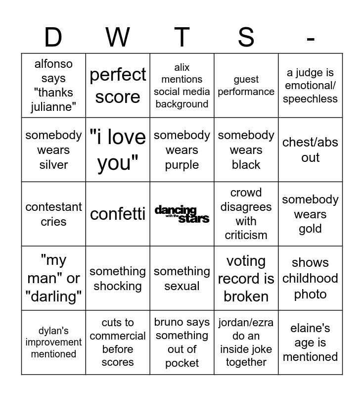 This bingo card has a free space and 45 words: elaine's injury is mentioned, elaine's age is mentioned, lisa anne walters in attendance, dylan's improvement mentioned, jordan does gymnastics, jordan/ezra do an inside joke together, alix mentions social media background, robert credits his family, a judge is emotional/ speechless, cuts to commercial before scores, guest performance, crowd disagrees with criticism, something sexual, something shocking, tour is mentioned, bruno says something out of pocket, an eliminated star is shown, contestant cries, celebrity sighting, chest/abs out, perfect score, celeb gives credit to the pro, "best dance yet", alfonso says "thanks julianne", alfonso says "the ballroom is on their feet", somebody wears gold, mentions last weeks elimination, derek pokes his head in the corner of the screen, voting record is broken, "my man" or "darling", spotlight put on mirrorball, shows childhood photo, flashback summary of whole season, winner gets put on shoulders, julianne says "thanks alfonso", confetti, talks about the dwts community/ family, prop used, somebody wears red, somebody wears purple, somebody wears silver, somebody wears black, costume change during dance, "i love you" and "i'm so thankful/ grateful for this opportunity".