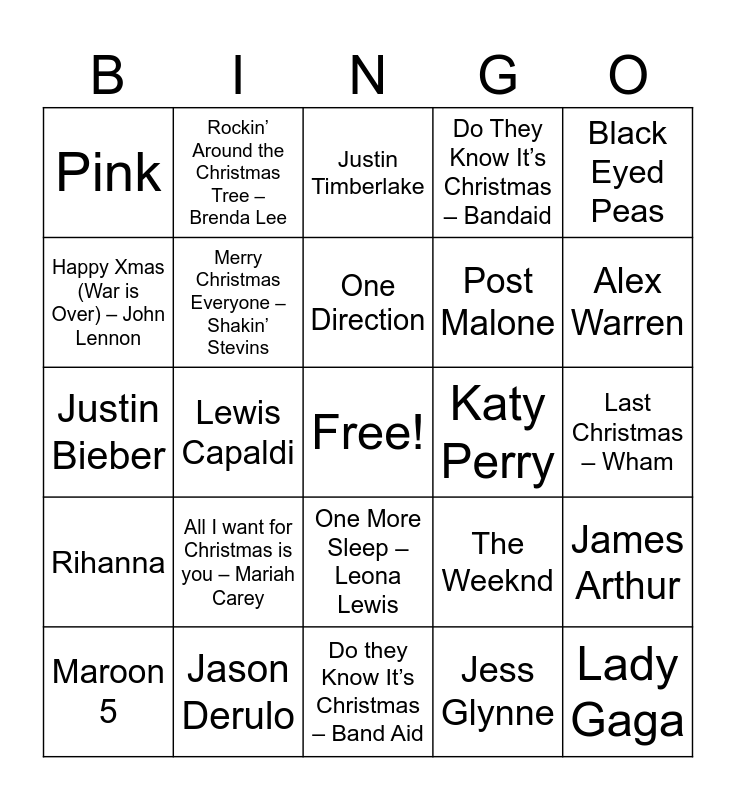 This bingo card has a free space and 35 words: Step into Christmas – Elton John, Fairytale of New York – The Pogues, Merry Xmas Everybody – Slade, Merry Christmas Everyone – Shakin’ Stevins, One More Sleep – Leona Lewis, Do They Know It’s Christmas – Bandaid, Happy Xmas (War is Over) – John Lennon, Ed Sheeran, One Direction, Bruno Mars, Justin Bieber, Black Eyed Peas, Adele, Benson Boone, Pink, Katy Perry, Jess Glynne, Lewis Capaldi, Rihanna, Lady Gaga, The Weeknd, Maroon 5, James Arthur, Jason Derulo, Justin Timberlake, Alex Warren, Lola Young, Coldplay, Post Malone, Last Christmas – Wham, Underneath the Tree – Kelly Clarkson, Do they Know It’s Christmas – Band Aid, All I want for Christmas is you – Mariah Carey, Rockin’ Around the Christmas Tree – Brenda Lee and Wonderful Christmastime – Paul McCartney.