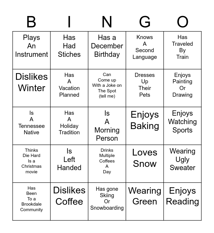 This bingo card has 25 words: Thinks Die Hard Is a Christmas movie, Dislikes Coffee, Is A Morning Person, Wearing Green, Has Traveled By Train, Plays An Instrument, Has Had Stiches, Has a December Birthday, Enjoys Baking, Wearing Ugly Sweater, Dislikes Winter, Has A Vacation Planned, Has gone Skiing Or Snowboarding, Loves Snow, Enjoys Painting Or Drawing, Has Been To a Brookdale Community, Has A Holiday Tradition, Can Come up With a Joke on The Spot (tell me), Dresses Up Their Pets, Enjoys Watching Sports, Is A Tennessee Native, Is Left Handed, Drinks Multiple Coffees A Day, Knows A Second Language and Enjoys Reading.