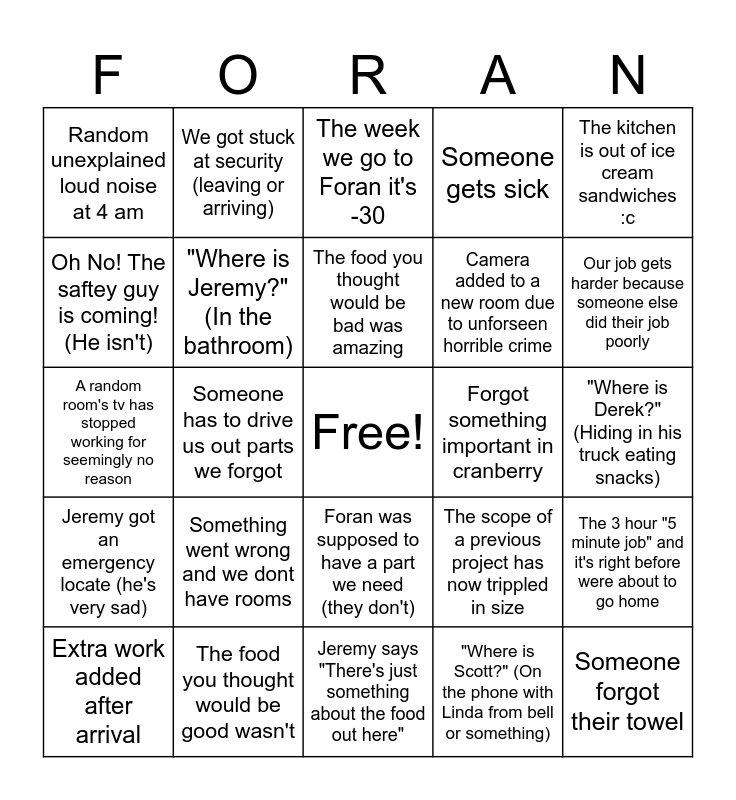 This bingo card has a free space and 24 words: Something went wrong and we dont have rooms, The food you thought would be good wasn't, The food you thought would be bad was amazing, Extra work added after arrival, The kitchen is out of ice cream sandwiches :c, Random unexplained loud noise at 4 am, Oh No! The saftey guy is coming! (He isn't), We got stuck at security (leaving or arriving), Forgot something important in cranberry, Foran was supposed to have a part we need (they don't), Camera added to a new room due to unforseen horrible crime, A random room's tv has stopped working for seemingly no reason, The scope of a previous project has now trippled in size, The 3 hour "5 minute job" and it's right before were about to go home, "Where is Jeremy?" (In the bathroom), "Where is Scott?" (On the phone with Linda from bell or something), "Where is Derek?" (Hiding in his truck eating snacks), The week we go to Foran it's -30, Our job gets harder because someone else did their job poorly, Someone has to drive us out parts we forgot, Someone forgot their towel, Jeremy got an emergency locate (he's very sad), Someone gets sick and Jeremy says "There's just something about the food out here".
