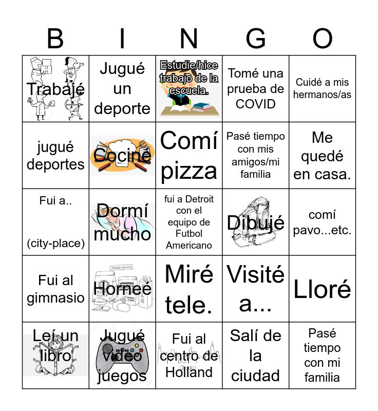 This bingo card has 11 images, a free space and 29 words: Leí un libro, Hice tamales, Dormí mucho, Fui de compras, Trabajé, Estudie/hice trabajo de la escuela., Cociné, Horneé, Dibujé, Jugué video juegos, comí pavo...etc., Pasé tiempo con mi familia, Fui al centro de Holland, Salí de la ciudad, Me quedé en casa., Publiqué un TikTok, Miré tele., Fui al gimnasio, Cuidé a mis hermanos/as, Fui a.. (city-place), Visité a..., Tuve una cita romántica, Pasé tiempo con mis amigos/mi familia, jugué deportes, Tomé una prueba de COVID, Jugué un deporte, Lloré, Comí pizza and Miré algo en español.