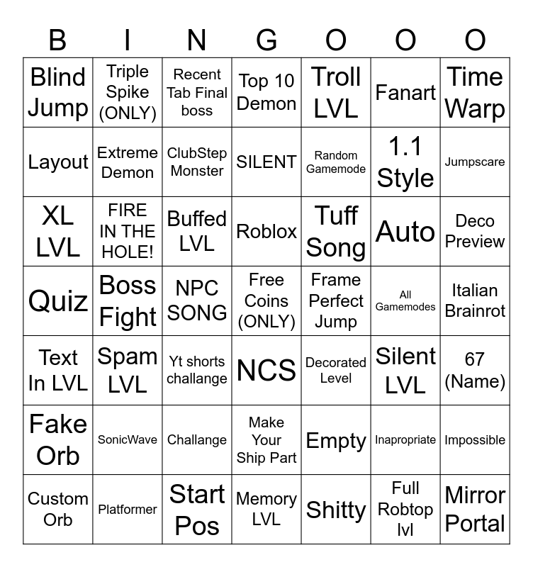 This bingo card has a free space and 48 words: Empty, 1.1 Style, Memory LVL, Boss Fight, Buffed LVL, Italian Brainrot, Triple Spike (ONLY), Platformer, Fanart, NCS, Time Warp, Top 10 Demon, Auto, Tuff Song, Fake Orb, All Gamemodes, Layout, Jumpscare, Inapropriate, Troll LVL, Random Gamemode, NPC SONG, Blind Jump, Extreme Demon, Impossible, ClubStep Monster, Deco Preview, Custom Orb, Roblox, FIRE IN THE HOLE!, Full Robtop lvl, Frame Perfect Jump, 67 (Name), SonicWave, Quiz, Decorated Level, Silent LVL, XL LVL, Yt shorts challange, Challange, Text In LVL, Mirror Portal, Recent Tab Final boss, Start Pos, SILENT, Make Your Ship Part, Spam LVL and Shitty.