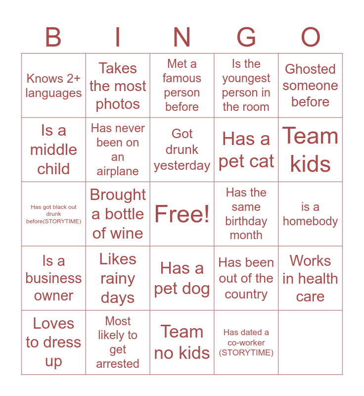 This bingo card has a free space and 24 words: Is a business owner, Most likely to get arrested, Has a pet dog, Has been out of the country, Ghosted someone before, Knows 2+ languages, Takes the most photos, Met a famous person before, Has a pet cat, Works in health care, Is a middle child, Has never been on an airplane, Played a sport, Has the same birthday month, Team kids, Loves to dress up, Brought a bottle of wine, Got drunk yesterday, Is the youngest person in the room, is a homebody, Has got black out drunk before(STORYTIME), Likes rainy days, Team no kids and Has dated a co-worker (STORYTIME).