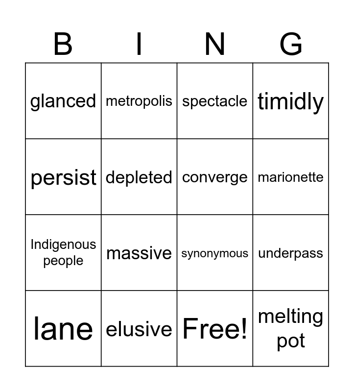 This bingo card has 17 words: Free!, lane, spectacle, glanced, massive, timidly, underpass, converge, marionette, depleted, elusive, synonymous, persist, metropolis, Indigenous people, float and melting pot.