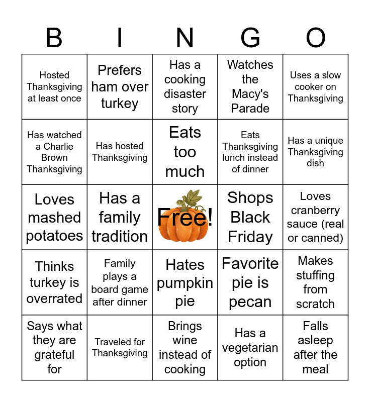 This bingo card has a free space and 24 words: Says what they are grateful for, Family plays a board game after dinner, Eats too much, Has a vegetarian option, Uses a slow cooker on Thanksgiving, Hosted Thanksgiving at least once, Prefers ham over turkey, Has a cooking disaster story, Shops Black Friday, Loves cranberry sauce (real or canned), Loves mashed potatoes, Has hosted Thanksgiving, Favorite pie is pecan, Makes stuffing from scratch, Has watched a Charlie Brown Thanksgiving, Traveled for Thanksgiving, Brings wine instead of cooking, Watches the Macy's Parade, Has a unique Thanksgiving dish, Thinks turkey is overrated, Has a family tradition, Hates pumpkin pie, Eats Thanksgiving lunch instead of dinner and Falls asleep after the meal.