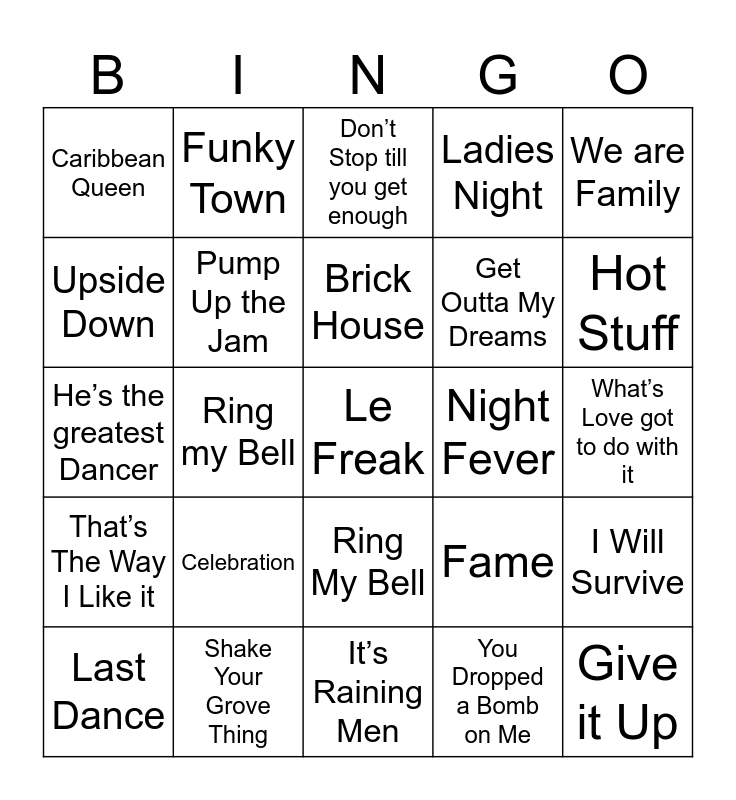 This bingo card has 47 words: Boogie Wonderland, Le Freak, Stayin Alive, It’s Raining Men, Celebration, Dancing Queen, Funky Town, I’m so excited, Upside Down, Never can say Goodbye, Pump Up the Jam, Ladies Night, I Will Survive, Fame, You should be Dancing, Super Freak, Brick House, Night Fever, Car Wash, We are Family, Ring my Bell, You Dropped a Bomb on Me, Caribbean Queen, Get Outta My Dreams, December 1963, Hot Stuff, Last Dance, Shake Your Body, Ring My Bell, That’s The Way I Like it, You Sexy Thing, Get Down on It, Get Down Tonight, Play that Funky Music, She Works Hard for the Money, Shake Your Grove Thing, What’s Love got to do with it, Get up offa that Thing, Push It, I’m Coming Out, Give it Up, Don’t Stop till you get enough, He’s the greatest Dancer, Good Times, YMCA, Disco Inferno and Rock the Boat.