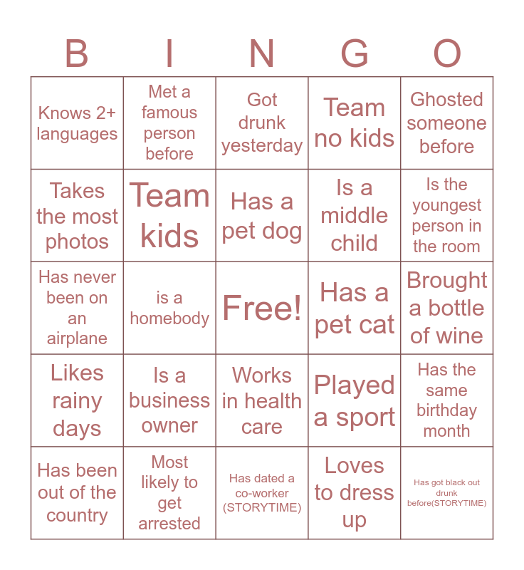 This bingo card has a free space and 24 words: Is a business owner, Most likely to get arrested, Has a pet dog, Has been out of the country, Ghosted someone before, Knows 2+ languages, Takes the most photos, Met a famous person before, Has a pet cat, Works in health care, Is a middle child, Has never been on an airplane, Played a sport, Has the same birthday month, Team kids, Loves to dress up, Brought a bottle of wine, Got drunk yesterday, Is the youngest person in the room, is a homebody, Has got black out drunk before(STORYTIME), Likes rainy days, Team no kids and Has dated a co-worker (STORYTIME).