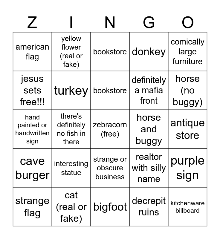This bingo card has a free space and 29 words: strange flag, black and white stereotypical cows, there's definitely no fish in there, migrating flock of birds, american flag, bookstore, turkey, interesting statue, horse and buggy, cat (real or fake), antique store, kitchenware billboard, bigfoot, decrepit ruins, horse (no buggy), suspicious gas station, strange or obscure business, cave burger, comically large furniture, hand painted or handwritten sign, realtor with silly name, something cool (as decided by car), definitely a mafia front, jesus sets free!!!, donkey, yellow flower (real or fake), purple sign, bookstore and probably odin or zeus in disguise.