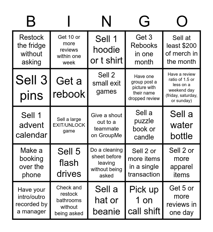 This bingo card has a free space and 24 words: Sell 5 flash drives, Check and restock bathrooms without being asked, Sell 2 small exit games, Have your intro/outro recorded by a manager, Sell at least $200 of merch in the month, Restock the fridge without asking, Sell 3 pins, Get 10 or more reviews within one week, Sell a puzzle book or candle, Do a cleaning sheet before leaving without being asked, Have one group post a picture with their name dropped review, Sell 1 advent calendar, Sell 2 or more items in a single transaction, Sell 2 or more apparel items, Get a rebook, Pick up 1 on call shift, Sell a water bottle, Sell 1 hoodie or t shirt, Have a review ratio of 1.5 or less on a weekend day (friday, saturday, or sunday), Sell a large EXIT/UNLOCK game, Get 5 or more reviews in one day, Make a booking over the phone, Get 3 Rebooks in one month and Sell a hat or beanie.