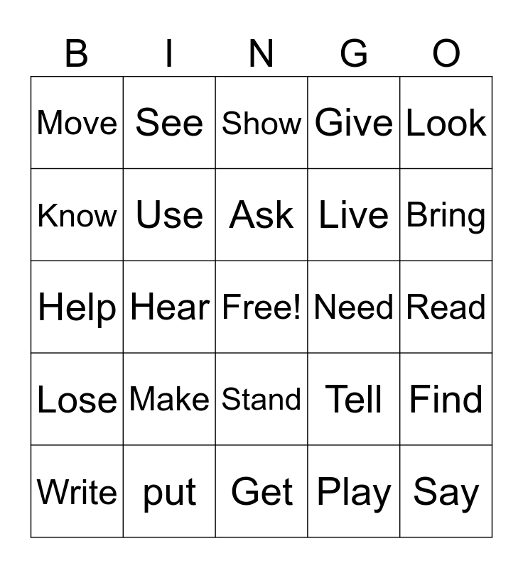 This bingo card has a free space and 49 words: Do, Say, Go, Get, Make, Take, See, Come, Know, Think, Use, Give, Find, Tell, Work, Feel, Ask, Need, Want, Look, Hear, Play, Move, Live, Hold, Bring, Write, Sit, Stand, Lose, Pay, Meet, Include, hange, put, Learn, Understand, Speak, Read, Watch, Call, Keep, Let, Begin, Help, Show, Run, Leave and carry.