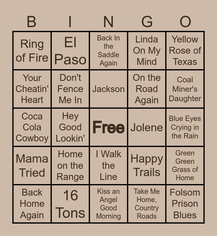 This bingo card has a free space and 29 words: Back Home Again, Cold, Cold, Heart, Hey Good Lookin', King of the Road, Ring of Fire, Back In the Saddle Again, Don't Fence Me In, Home on the Range, Jolene, 16 Tons, Blue Eyes Crying in the Rain, Folsom Prison Blues, Kiss an Angel Good Morning, Take Me Home, Country Roads, Coal Miner's Daughter, The Gambler, I Walk the Line, Mama Tried, Yellow Rose of Texas, Coca Cola Cowboy, Happy Trails, Jambalaya, On the Road Again, Your Cheatin' Heart, Linda On My Mind, El Paso, Green Green Grass of Home, Jackson and These Boots Were Made for Walking.