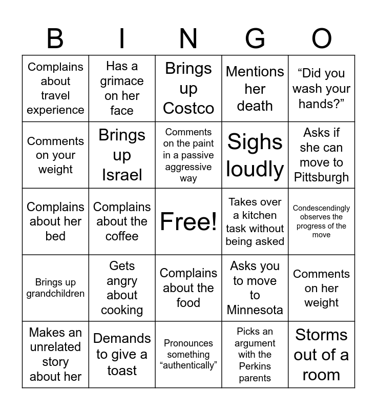 This bingo card has a free space and 24 words: Gets angry about cooking, Demands to give a toast, Comments on the paint in a passive aggressive way, Makes an unrelated story about her, “Did you wash your hands?”, Complains about travel experience, Comments on your weight, Has a grimace on her face, Takes over a kitchen task without being asked, Complains about the food, Sighs loudly, Complains about her bed, Asks you to move to Minnesota, Comments on her weight, Brings up Israel, Picks an argument with the Perkins parents, Condescendingly observes the progress of the move, Brings up Costco, Asks if she can move to Pittsburgh, Complains about the coffee, Storms out of a room, Brings up grandchildren, Mentions her death and Pronounces something “authentically”.