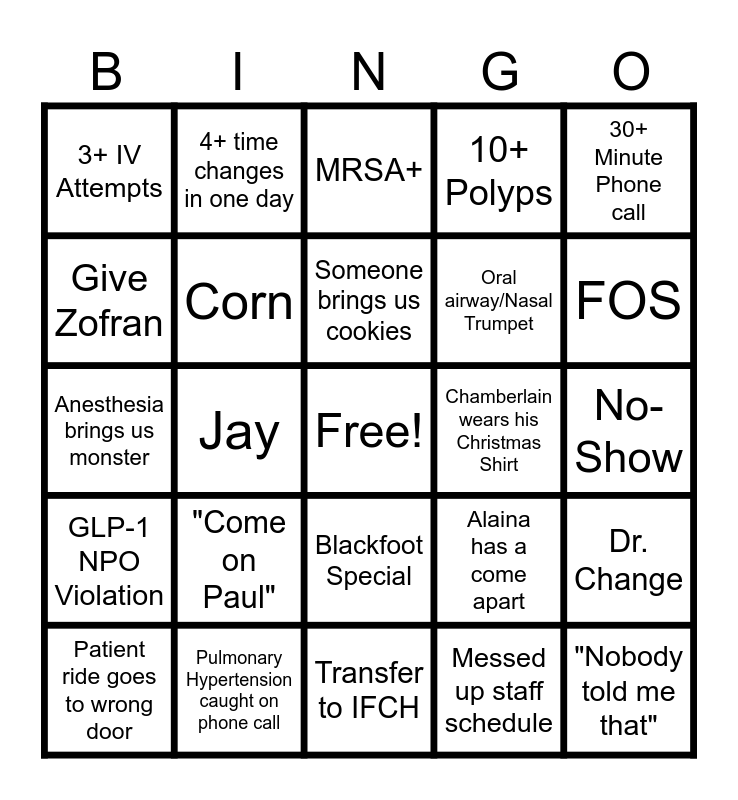 This bingo card has a free space and 37 words: >1hr procedure, Couple Colonoscopy, "How many of these do you do a day?", Corn, Dr. Change, "Come on Paul", Someone brings us cookies, Cancellectomy, 30+ Minute Phone call, Give D-10, Jay, 10+ Polyps, "Nobody told me that", No-Show, Give Zofran, GLP-1 NPO Violation, Spanish Speaking, MRSA+, Blackfoot Special, Chamberlain wears his Christmas Shirt, 3+ IV Attempts, FOS, Patient ride goes to wrong door, Transfer to IFCH, Here after 6 on a Friday, Messed up staff schedule, 4+ time changes in one day, "Didn't sleep at all last night", "How long have you worked", Staff gets called the wrong name by someone, "You have the worst job/I feel sorry for you guys", Pulmonary Hypertension caught on phone call, Anesthesia brings us monster, Joke about "Endo, Pain Clinic" sign, Alaina has a come apart, Oral airway/Nasal Trumpet and OR Needs a tech.