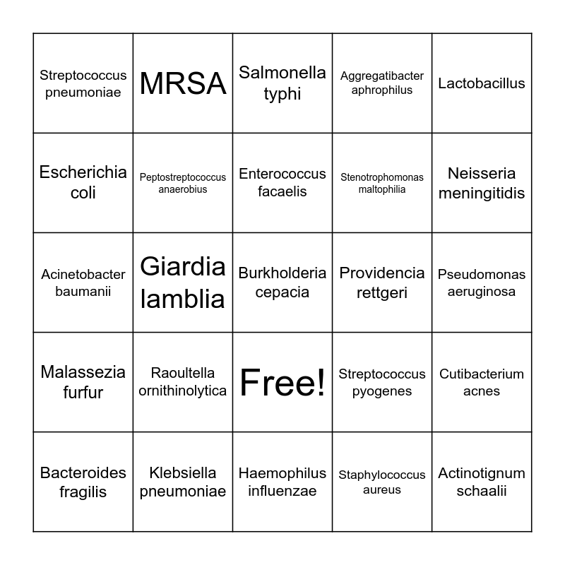 This bingo card has 26 words: Free!, Staphylococcus aureus, Enterococcus facaelis, Klebsiella pneumoniae, Lactobacillus, Streptococcus pneumoniae, Escherichia coli, MRSA, Pseudomonas aeruginosa, Streptococcus pyogenes, Stenotrophomonas maltophilia, Acinetobacter baumanii, Cutibacterium acnes, Bacteroides fragilis, Giardia lamblia, Cryptosporidium, Aggregatibacter aphrophilus, Malassezia furfur, Salmonella typhi, Burkholderia cepacia, Neisseria meningitidis, Haemophilus influenzae, Providencia rettgeri, Raoultella ornithinolytica, Peptostreptococcus anaerobius and Actinotignum schaalii.
