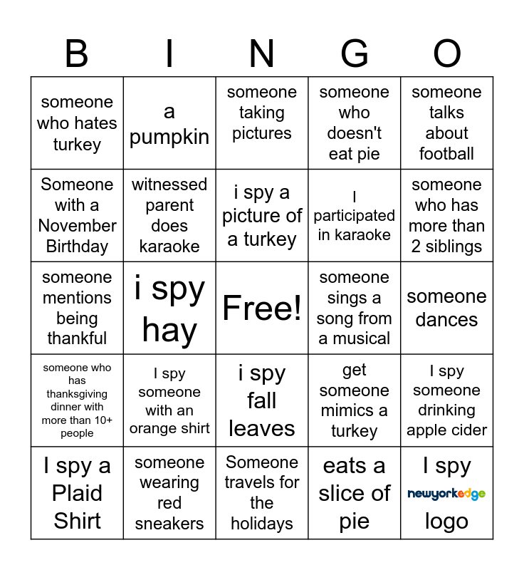 This bingo card has 1 images, a free space and 24 words: I spy a Plaid Shirt, I spy someone with an orange shirt, i spy a picture of a turkey, eats a slice of pie, someone talks about football, someone who hates turkey, a pumpkin, someone taking pictures, someone sings a song from a musical, someone dances, someone mentions being thankful, witnessed parent does karaoke, get someone mimics a turkey, I spy someone drinking apple cider, Someone with a November Birthday, someone wearing red sneakers, Someone travels for the holidays, someone who doesn't eat pie, someone who has more than 2 siblings, someone who has thanksgiving dinner with more than 10+ people, i spy hay, i spy fall leaves, I participated in karaoke and I spy logo.