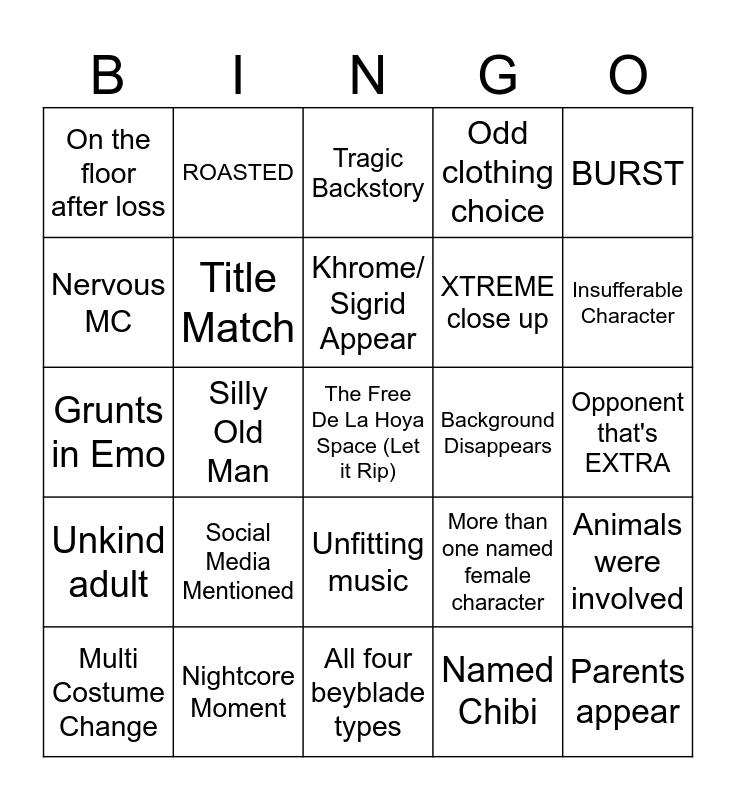 This bingo card has a free space and 24 words: Social Media Mentioned, Nightcore Moment, Khrome/ Sigrid Appear, Multi Costume Change, BURST, On the floor after loss, Nervous MC, ROASTED, Background Disappears, Unfitting music, XTREME close up, Grunts in Emo, More than one named female character, Animals were involved, Title Match, Named Chibi, Opponent that's EXTRA, Tragic Backstory, Insufferable Character, Silly Old Man, Parents appear, Unkind adult, Odd clothing choice and All four beyblade types.