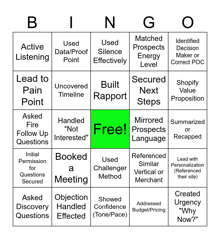 This bingo card has a free space and 24 words: Booked a Meeting, Objection Handled Effected, Built Rapport, Asked Discovery Questions, Identified Decision Maker or Correct POC, Active Listening, Lead to Pain Point, Used Data/Proof Point, Mirrored Prospects Language, Used Challenger Method, Secured Next Steps, Asked Fire Follow Up Questions, Referenced Similar Vertical or Merchant, Lead with Personalization (Referenced their site), Uncovered Timeline, Addressed Budget/Pricing, Summarized or Recapped, Used Silence Effectively, Shopify Value Proposition, Handled "Not Interested", Created Urgency "Why Now?", Initial Permission for Questions Secured, Matched Prospects Energy Level and Showed Confidence (Tone/Pace).