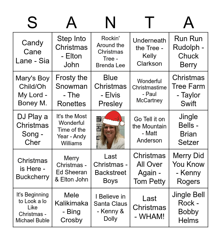 This bingo card has a free space and 43 words: Little Drummer Boy - Justin Bieber, Jingle Bell Rock - Bobby Helms, All I Want for Christmas is You - Mariah Carey FEAT Justin Bieber, It's Beginning to Look a lo Like Christmas - Michael Buble, Santa Claus is Coming to Town - Frank Sinatra, Last Christmas - WHAM!, Rockin' Around the Christmas Tree - Brenda Lee, Feliz Navidad - Jose Feliciano, Run Run Rudolph - Chuck Berry, Mele Kalikimaka - Bing Crosby, Underneath the Tree - Kelly Clarkson, Go Tell it on the Mountain - Matt Anderson, Last Christmas - Backstreet Boys, Merry Christmas - Ed Sheeran & Elton John, Mistletoe - Justin Bieber, I Believe in Santa Claus - Kenny & Dolly, Do you Hear What I Hear? - Bing Crosby, DJ Play a Christmas Song - Cher, Drop Top Sleigh Ride - Cher FEAT Tyga, Christmas Tree Farm - Taylor Swift, Step Into Christmas - Elton John, Les 12 Jour de Noel - Les Merchants Maquereaux, River - Blue Rodeo, Candy Cane Lane - Sia, Hey Santa! - Carnie Wilson & Wendy Wilson, Jingle Bells - Brian Setzer, Carol of the Bells - Trans Siberian Orchestra, Must be Santa - Mitch Miller, Christmas All Over Again - Tom Petty, Christmas is Here - Buckcherry, Merry Christmas (Happy Holidays) - NSYNC, Merry Did You Know - Kenny Rogers, Sleigh Ride - The Ronettes, It's the Most Wonderful Time of the Year - Andy Williams, Snowman - Sia, Christmas (Baby Please Come Home) - Darlene Love, Santa Claus is Coming to Town - Bruce Springsteen, Blue Christmas - Elvis Presley, Mary's Boy Child/Oh My Lord - Boney M., Wonderful Christmastime - Paul McCartney, You're a Mean One Mr. Grinch - Thurl Ravenscroft, Frosty the Snowman - The Ronettes and Christmas Wrapping - The Waitressess.
