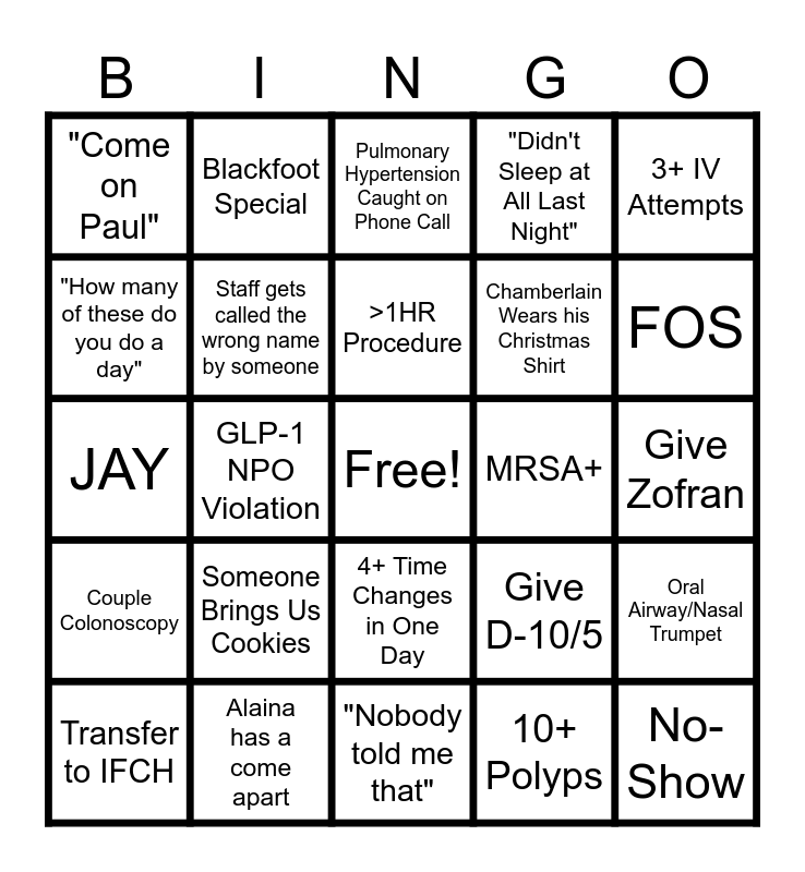 This bingo card has a free space and 37 words: Corn, 30+ Minute Phone Call, Joke about "Endo, Pain Clinic" sign, Staff gets called the wrong name by someone, Oral Airway/Nasal Trumpet, Someone Brings Us Cookies, >1HR Procedure, Spanish Speaking, 3+ IV Attempts, "You have the worst job/ I feel sorry for you", GLP-1 NPO Violation, "Didn't Sleep at All Last Night", No-Show, Give Zofran, "How many of these do you do a day", Couple Colonoscopy, OR Needs Tech, Pulmonary Hypertension Caught on Phone Call, 4+ Time Changes in One Day, MRSA+, "Come on Paul", FOS, Transfer to IFCH, "Nobody told me that", Cancellectomy, 10+ Polyps, Blackfoot Special, Patient Ride Goes to Wrong Door, Anesthesia Brings us Monster, Dr. Change, Here After 6 on a Friday, Alaina has a come apart, JAY, Messed up Staff Schedule, Give D-10/5, Chamberlain Wears his Christmas Shirt and "How long have you worked here?".