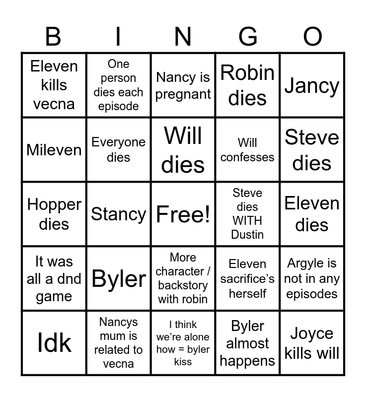 This bingo card has a free space and 24 words: Byler, Nancys mum is related to vecna, Will dies, Idk, Jancy, Eleven kills vecna, Mileven, One person dies each episode, Steve dies WITH Dustin, More character / backstory with robin, Will confesses, Hopper dies, Eleven sacrifice’s herself, Argyle is not in any episodes, Everyone dies, Byler almost happens, Eleven dies, Nancy is pregnant, Steve dies, Stancy, Joyce kills will, It was all a dnd game, Robin dies and I think we’re alone how = byler kiss.