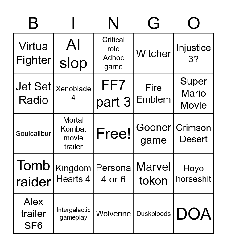 This bingo card has a free space and 24 words: Kingdom Hearts 4, Intergalactic gameplay, FF7 part 3, Alex trailer SF6, Injustice 3?, Virtua Fighter, Jet Set Radio, AI slop, Gooner game, Persona 4 or 6, Fire Emblem, Soulcalibur, Marvel tokon, Hoyo horseshit, Xenoblade 4, Duskbloods, Crimson Desert, Critical role Adhoc game, Super Mario Movie, Mortal Kombat movie trailer, DOA, Tomb raider, Witcher and Wolverine.