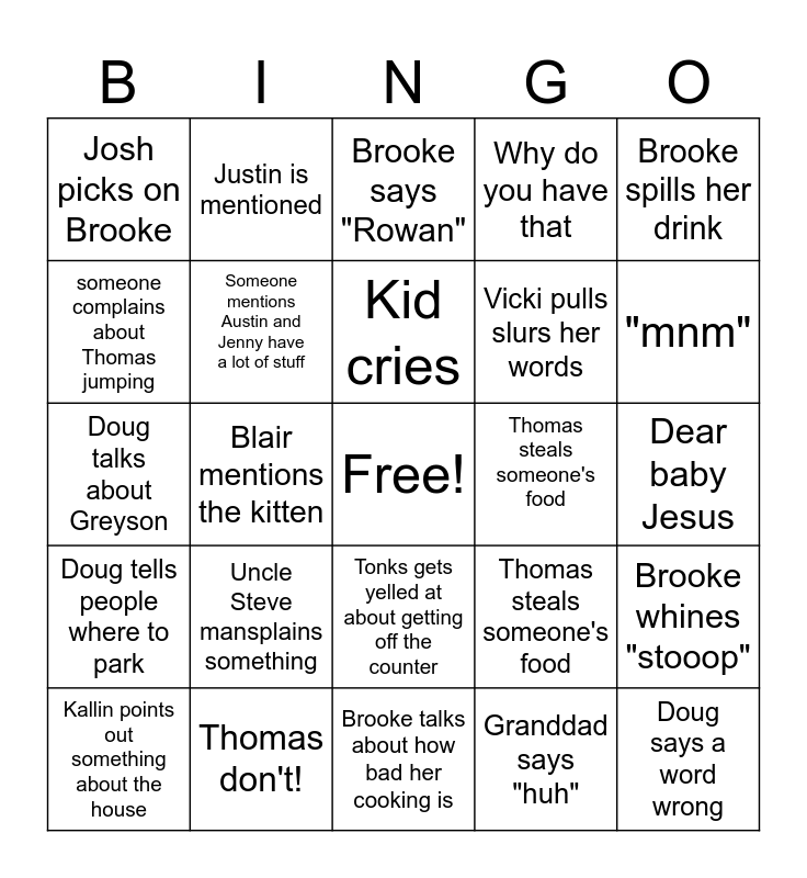 This bingo card has a free space and 29 words: Doug says "Kallin", Thomas don't!, Brooke says "Rowan", What you should do, Brooke spills her drink, Josh picks on Brooke, Someone mentions Austin and Jenny have a lot of stuff, Kid cries, Thomas steals someone's food, Brooke whines "stooop", Kallin points out something about the house, Blair mentions the kitten, Granddad says "huh", Doug says a word wrong, Doug talks about Greyson, Tarin talks about golf, Brooke talks about how bad her cooking is, Thomas steals someone's food, "mnm", Doug tells people where to park, Uncle Steve mansplains something, Vicki starts crying, Vicki pulls slurs her words, Dear baby Jesus, someone complains about Thomas jumping, Justin is mentioned, Tonks gets yelled at about getting off the counter, Why do you have that and There are a lot of plants.