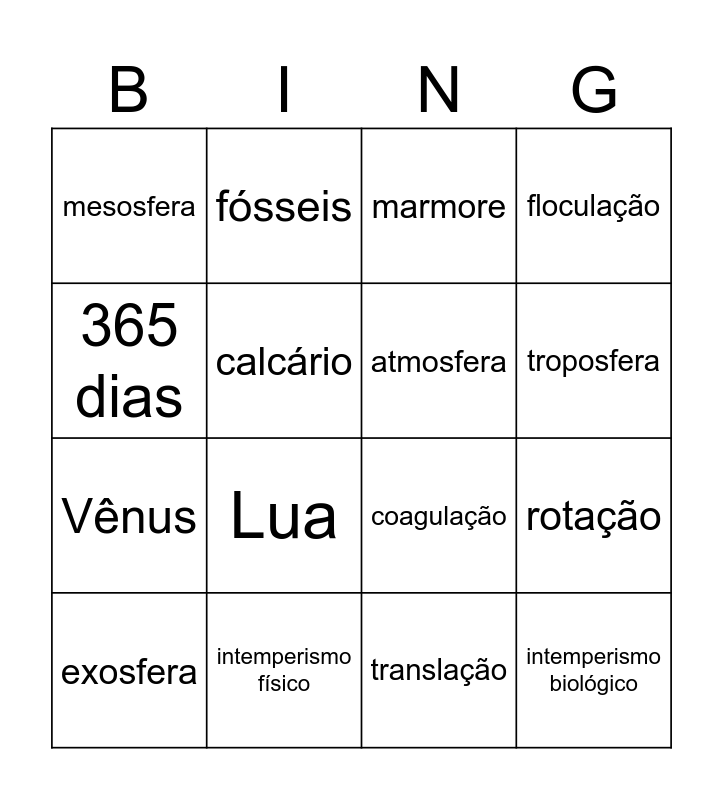 This bingo card has 28 words: mercúrio, Netuno, Vênus, saturno, calcário, marmore, fósseis, intemperismo biológico, intemperismo físico, intemperismo químico, coagulação, floculação, sol, Lua cheia, Lua, litosfera, biosfera, atmosfera, troposfera, estratosfera, mesosfera, termosfera, exosfera, rotação, translação, 24 horas, 365 dias and Terra.