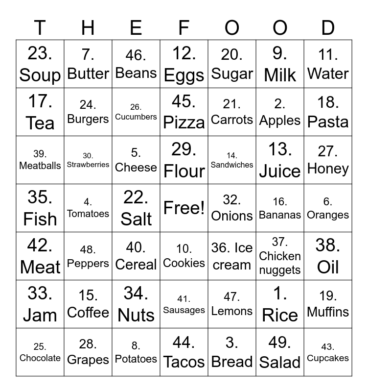 This bingo card has a free space and 49 words: 1. Rice, 2. Apples, 3. Bread, 4. Tomatoes, 5. Cheese, 6. Oranges, 7. Butter, 8. Potatoes, 9. Milk, 10. Cookies, 11. Water, 12. Eggs, 13. Juice, 14. Sandwiches, 15. Coffee, 16. Bananas, 17. Tea, 18. Pasta, 19. Muffins, 20. Sugar, 21. Carrots, 22. Salt, 23. Soup, 24. Burgers, 25. Chocolate, 26. Cucumbers, 27. Honey, 28. Grapes, 29. Flour, 30. Strawberries, 31. Yogurt, 32. Onions, 33. Jam, 34. Nuts, 35. Fish, 36. Ice cream, 37. Chicken nuggets, 38. Oil, 39. Meatballs, 40. Cereal, 41. Sausages, 42. Meat, 43. Cupcakes, 44. Tacos, 45. Pizza, 46. Beans, 47. Lemons, 48. Peppers and 49. Salad.