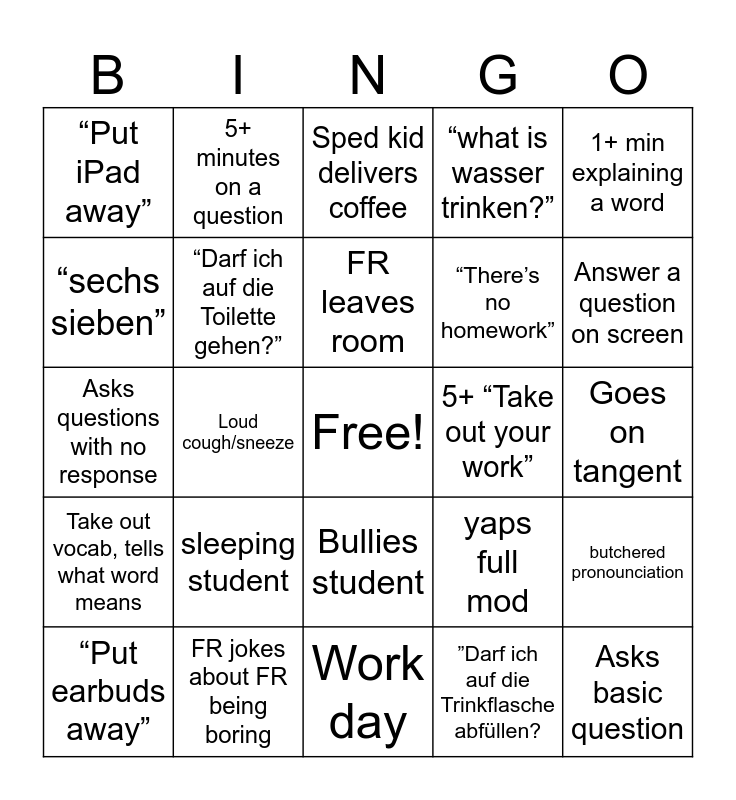 This bingo card has a free space and 24 words: sleeping student, FR jokes about FR being boring, FR leaves room, “Put earbuds away”, 1+ min explaining a word, “Put iPad away”, “sechs sieben”, 5+ minutes on a question, 5+ “Take out your work”, Bullies student, “There’s no homework”, Asks questions with no response, yaps full mod, butchered pronounciation, “Darf ich auf die Toilette gehen?”, ”Darf ich auf die Trinkflasche abfüllen?, Goes on tangent, Sped kid delivers coffee, Answer a question on screen, Loud cough/sneeze, Asks basic question, Take out vocab, tells what word means, “what is wasser trinken?” and Work day.