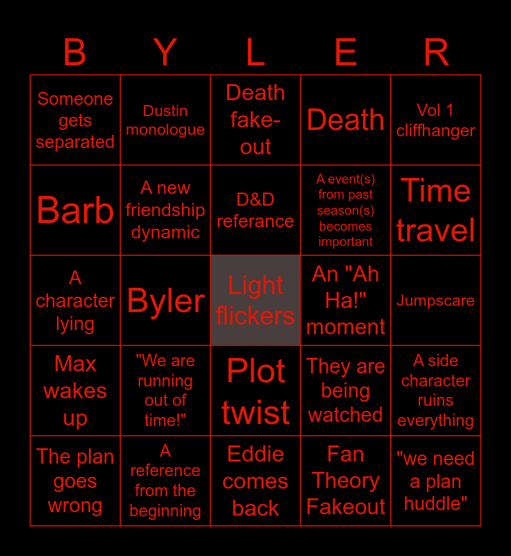 This bingo card has a free space and 24 words: "We are running out of time!", A reference from the beginning, D&D referance, The plan goes wrong, Vol 1 cliffhanger, Someone gets separated, Barb, Dustin monologue, An "Ah Ha!" moment, Plot twist, A event(s) from past season(s) becomes important, A character lying, They are being watched, A side character ruins everything, A new friendship dynamic, Fan Theory Fakeout, Jumpscare, Death fake-out, Time travel, Byler, "we need a plan huddle", Max wakes up, Death and Eddie comes back.