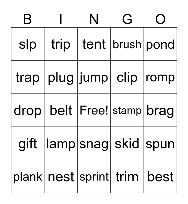 This bingo card has a free space and 24 words: lamp, nest, jump, plank, pond, slp, trap, trip, stamp, snag, clip, drop, skid, spun, plug, trim, brag, tent, romp, belt, best, gift, brush and sprint.