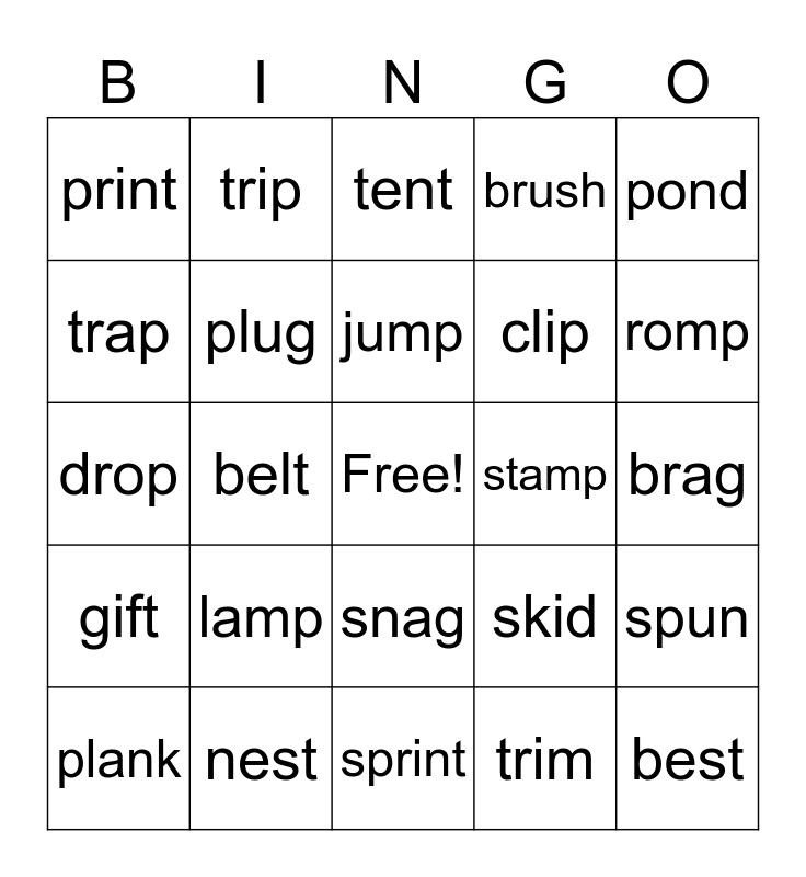 This bingo card has a free space and 24 words: lamp, nest, jump, plank, pond, print, trap, trip, stamp, snag, clip, drop, skid, spun, plug, trim, brag, tent, romp, belt, best, gift, brush and sprint.