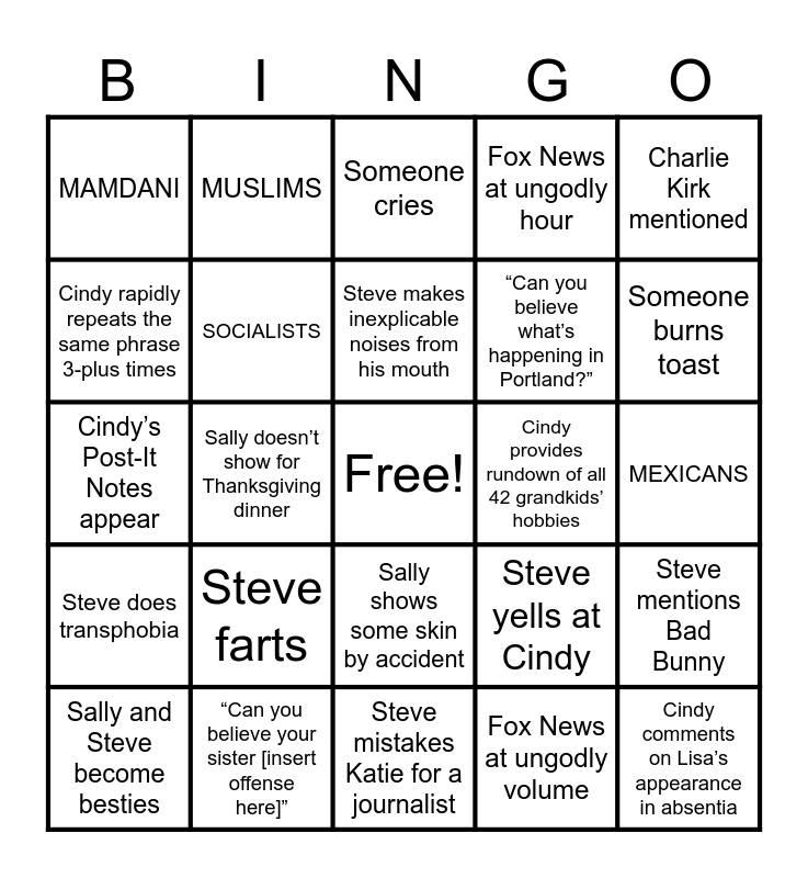 This bingo card has a free space and 24 words: Steve farts, “Can you believe your sister [insert offense here]”, Steve makes inexplicable noises from his mouth, Sally and Steve become besties, Charlie Kirk mentioned, MAMDANI, Cindy rapidly repeats the same phrase 3-plus times, MUSLIMS, Cindy provides rundown of all 42 grandkids’ hobbies, Sally shows some skin by accident, “Can you believe what’s happening in Portland?”, Cindy’s Post-It Notes appear, Steve yells at Cindy, Steve mentions Bad Bunny, SOCIALISTS, Fox News at ungodly volume, MEXICANS, Someone cries, Someone burns toast, Sally doesn’t show for Thanksgiving dinner, Cindy comments on Lisa’s appearance in absentia, Steve does transphobia, Fox News at ungodly hour and Steve mistakes Katie for a journalist.