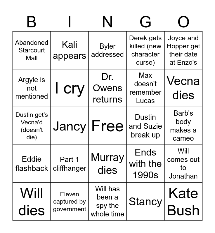 This bingo card has a free space and 24 words: Will dies, Part 1 cliffhanger, Dr. Owens returns, Stancy, Joyce and Hopper get their date at Enzo's, Abandoned Starcourt Mall, Kali appears, Byler addressed, Dustin and Suzie break up, Barb's body makes a cameo, Dustin get's Vecna'd (doesn't die), I cry, Ends with the 1990s, Will comes out to Jonathan, Argyle is not mentioned, Eleven captured by government, Will has been a spy the whole time, Derek gets killed (new character curse), Vecna dies, Eddie flashback, Jancy, Murray dies, Max doesn't remember Lucas and Kate Bush.