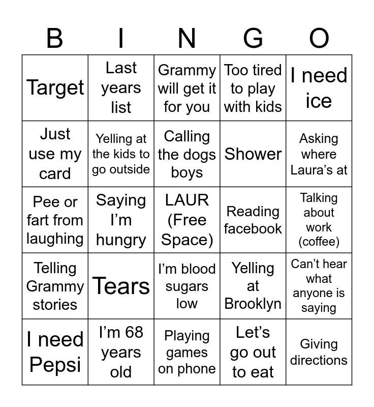 This bingo card has a free space and 24 words: Tears, I’m 68 years old, Calling the dogs boys, I need Pepsi, I need ice, Target, Just use my card, Last years list, Reading facebook, I’m blood sugars low, Shower, Pee or fart from laughing, Yelling at Brooklyn, Can’t hear what anyone is saying, Yelling at the kids to go outside, Let’s go out to eat, Talking about work (coffee), Grammy will get it for you, Asking where Laura’s at, Saying I’m hungry, Giving directions, Telling Grammy stories, Too tired to play with kids and Playing games on phone.