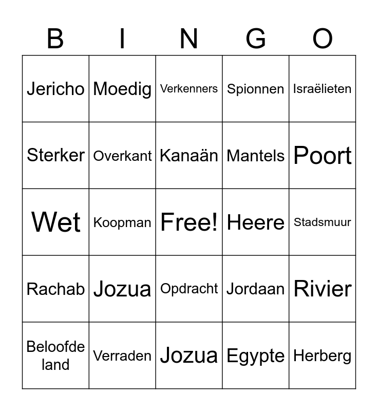 This bingo card has a free space and 25 words: Jozua, Jozua, Kanaän, Beloofde land, Israëlieten, Jericho, Sterker, Moedig, Heere, Opdracht, Mantels, Wet, Jordaan, Rivier, Overkant, Muur, Stadsmuur, Verkenners, Poort, Koopman, Herberg, Verraden, Rachab, Spionnen and Egypte.