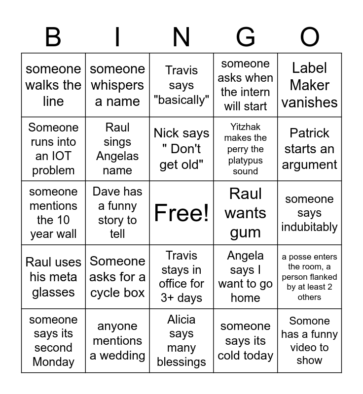 This bingo card has a free space and 24 words: someone says its second Monday, Someone asks for a cycle box, Nick says " Don't get old", someone says its cold today, Label Maker vanishes, someone walks the line, someone whispers a name, Travis says "basically", Raul wants gum, someone says indubitably, someone mentions the 10 year wall, Raul sings Angelas name, Angela says I want to go home, a posse enters the room, a person flanked by at least 2 others, Someone runs into an IOT problem, anyone mentions a wedding, Alicia says many blessings, someone asks when the intern will start, Patrick starts an argument, Raul uses his meta glasses, Dave has a funny story to tell, Travis stays in office for 3+ days, Yitzhak makes the perry the platypus sound and Somone has a funny video to show.
