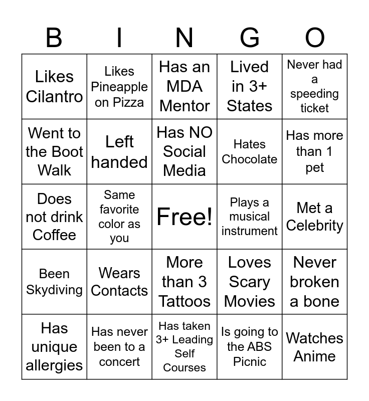 This bingo card has a free space and 29 words: Has unique allergies, Same Birth Month as you, Same favorite color as you, Only Child, Likes Cilantro, Has an MDA Mentor, Left handed, Wears Contacts, Plays a musical instrument, Has never been to a concert, Met a Celebrity, Watches Anime, Has taken 3+ Leading Self Courses, Is going to the ABS Picnic, Has more than 1 pet, Never seen Star Wars, More than 3 Tattoos, Been Skydiving, Never had a speeding ticket, Does not drink Coffee, Loves Scary Movies, Cat Person, Hates Chocolate, Went to the Boot Walk, Lived in 3+ States, Likes Pineapple on Pizza, Never broken a bone, Has NO Social Media and Hates Sushi.