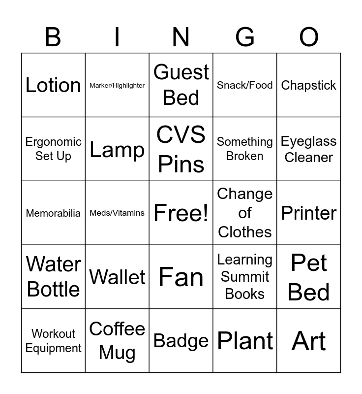 This bingo card has a free space and 60 words: Dirty Dish, Coffee Mug, Pictures, Water Bottle, Plant, Standing Desk, Lamp, Calendar, Something Broken, College Degree, Snack/Food, Trash, Ergonomic Set Up, Notebook, Planner, Lotion, Art, Chapstick, Furry Coworker, CVS Pins, Change of Clothes, Guest Bed, Workout Equipment, Pet Bed, Books, Kids’ Craft/Artwork, Nail Care Item, Stapler, Eyeglass Cleaner, ATD Magazine, Space Heater, Slippers, Blanket, Pen, Marker/Highlighter, Charger, Napkin, Meds/Vitamins, Motivational Quotes, Memorabilia, Mirror, Wallet, Printer, Bills, Learning Summit Books, Tissues, Bag, Remote, Celebration Cards, Fan, Badge, Candle, Alexa or Google Home, Pjs/Comfy Bottoms, Basketball Hoop, Delivered Meal, Trashcan, Energy Drink, Protein Bar and Trophy/Award.