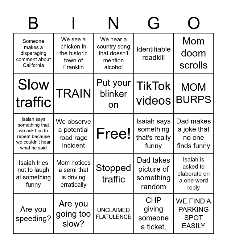 This bingo card has a free space and 29 words: Are you speeding?, Midwest license plate, We observe a potential road rage incident, Isaiah is asked to sing something and responds with "Not right now.", Someone makes a disparaging comment about California, We hear a country song that doesn't mention alcohol, TRAIN, Mom notices a semi that is driving erratically, Isaiah says something that's really funny, Are you going too slow?, Dad makes a joke that no one finds funny, WE FIND A PARKING SPOT EASILY, UNCLAIMED FLATULENCE, CHP giving someone a ticket., MOM BURPS, Dad IS unintentionally speeding, Stopped traffic, Isaiah tries not to laugh at something funny, Mom doom scrolls, Isaiah says something that we ask him to repeat because we couldn't hear what he said, Dad takes picture of something random, Mom sings a song that she just made up, TikTok videos, Slow traffic, Identifiable roadkill, We see a chicken in the historic town of Franklin, Isaiah is asked to elaborate on a one word reply, Put your blinker on and Mom starts using an unidentifiable accent.