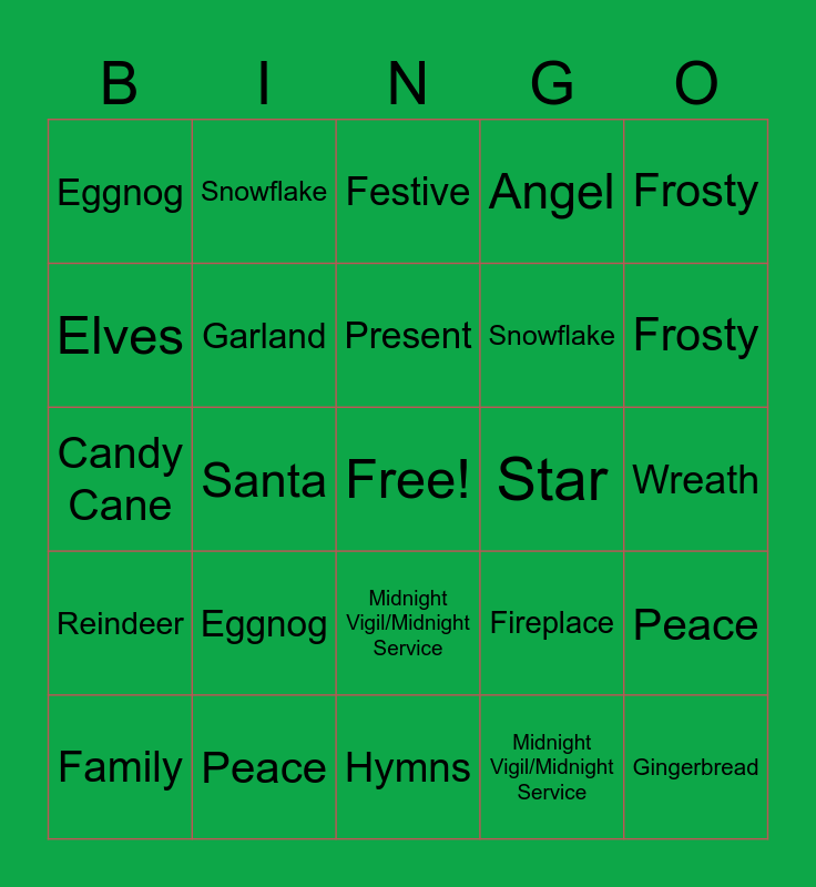This bingo card has a free space and 62 words: Joy, Peace, Noel, Reindeer, Sleigh, Stocking, Garland, Wreath, Snowflake, Ornament, Angel, Santa, Elves, Candy Cane, Nutcracker, Eggnog, Gingerbread, Frosty, Fireplace, Present, Star, Festive, Family, Midnight Vigil/Midnight Service, Hymns, Koliada/Carols, Feast, Joy, Peace, Noel, Reindeer, Sleigh, Stocking, Garland, Wreath, Snowflake, Ornament, Angel, Santa, Elves, Candy Cane, Nutcracker, Eggnog, Gingerbread, Frosty, Fireplace, Present, Star, Festive, Family, Midnight Vigil/Midnight Service, Hymns, Koliada/Carols, Feast, Merry, Tradition, Lights, Holly, Chestnuts, Movies, Home and Cookies.