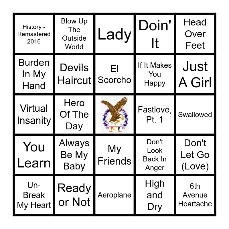 This bingo card has a free space and 50 words: 1979, 6th Avenue Heartache, A Long December, Aeroplane, Always Be My Baby, Big Me, Blow Up The Outside World, Bulls On Parade, Burden In My Hand, California Love - Original Version, Devils Haircut, Doin' It, Don't Let Go (Love), Don't Look Back In Anger, Don't Speak, E-Bow The Letter, El Scorcho, Fastlove, Pt. 1, Get Down (You're the One for Me) - LP Edit No Rap, Head Over Feet, Hero Of The Day, High and Dry, History - Remastered 2016, If It Makes You Happy, Ironic, It's All Coming Back to Me Now, Just A Girl, Killing Me Softly With His Song, Lady, My Friends, No Diggity, One Of Us, People of the Sun, Quit Playing Games (With My Heart), Ready or Not, Real World, Salvation, Say You'll Be There, Stupid Girl - Remastered 2015, Swallowed, Tha Crossroads, The Good Life, To the Moon & Back, Tonight, Tonight, Un-Break My Heart, Virtual Insanity, Wannabe, Who You Are, You Learn and You Were Meant For Me.