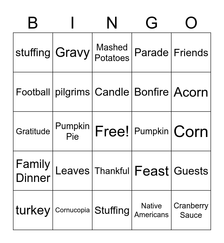 This bingo card has a free space and 29 words: turkey, autumn, Pumpkin Pie, Harvest, stuffing, Mashed Potatoes, pilgrims, Leaves, Pumpkin, Cornucopia, Corn, Cranberry Sauce, Stuffing, Native Americans, Acorn, Apple, Thankful, Family Dinner, Friends, Gratitude, Feast, Chef, Bonfire, Football, Parade, Gravy, Guests, Candle and Plate.