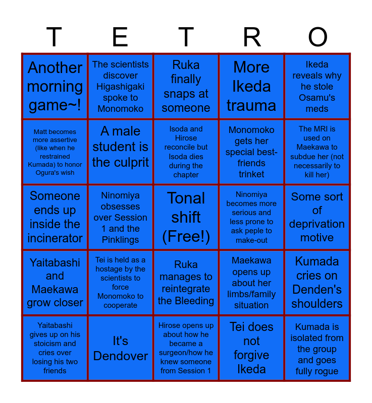 This bingo card has a free space and 24 words: Tei is held as a hostage by the scientists to force Monomoko to cooperate, It's Dendover, Isoda and Hirose reconcile but Isoda dies during the chapter, Yaitabashi gives up on his stoicism and cries over losing his two friends, Ikeda reveals why he stole Osamu's meds, Another morning game~!, Matt becomes more assertive (like when he restrained Kumada) to honor Ogura's wish, The scientists discover Higashigaki spoke to Monomoko, Ninomiya becomes more serious and less prone to ask peple to make-out, Ruka manages to reintegrate the Bleeding, Monomoko gets her special best-friends trinket, Someone ends up inside the incinerator, Maekawa opens up about her limbs/family situation, Kumada cries on Denden's shoulders, A male student is the culprit, Tei does not forgive Ikeda, Some sort of deprivation motive, Ruka finally snaps at someone, The MRI is used on Maekawa to subdue her (not necessarily to kill her), Ninomiya obsesses over Session 1 and the Pinklings, Kumada is isolated from the group and goes fully rogue, Yaitabashi and Maekawa grow closer, More Ikeda trauma and Hirose opens up about how he became a surgeon/how he knew someone from Session 1.