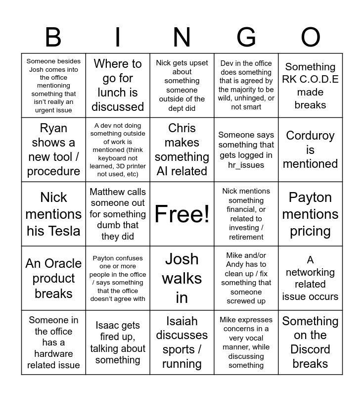 This bingo card has a free space and 24 words: Payton confuses one or more people in the office / says something that the office doesn’t agree with, Isaac gets fired up, talking about something, Chris makes something AI related, Someone in the office has a hardware related issue, Something RK C.O.D.E made breaks, Someone besides Josh comes into the office mentioning something that isn’t really an urgent issue, Ryan shows a new tool / procedure, Where to go for lunch is discussed, Nick mentions something financial, or related to investing / retirement, Josh walks in, Someone says something that gets logged in hr_issues, Nick mentions his Tesla, Mike and/or Andy has to clean up / fix something that someone screwed up, A networking related issue occurs, A dev not doing something outside of work is mentioned (think keyboard not learned, 3D printer not used, etc), Mike expresses concerns in a very vocal manner, while discussing something, Payton mentions pricing, Nick gets upset about something someone outside of the dept did, Corduroy is mentioned, Matthew calls someone out for something dumb that they did, Something on the Discord breaks, An Oracle product breaks, Dev in the office does something that is agreed by the majority to be wild, unhinged, or not smart and Isaiah discusses sports / running.