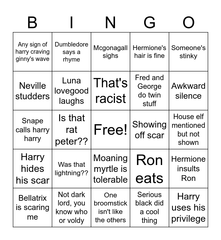 This bingo card has a free space and 27 words: Ron eats, Hermione corrects someone, Fred and George do twin stuff, One broomstick isn't like the others, Neville studders, Mcgonagall sighs, Dumbledore says a rhyme, Harry hides his scar, Showing off scar, Hermione insults Ron, Snape calls harry harry, Hermione's hair is fine, Bellatrix is scaring me, Not dark lord, you know who or voldy, Awkward silence, I see voldys tongue, Luna lovegood laughs, That's racist, Was that lightning??, Any sign of harry craving ginny's wave, House elf mentioned but not shown, Serious black did a cool thing, Is that rat peter??, Harry uses his privilege, Moaning myrtle is tolerable, Someone's stinky and Why are they wearing that hat??.