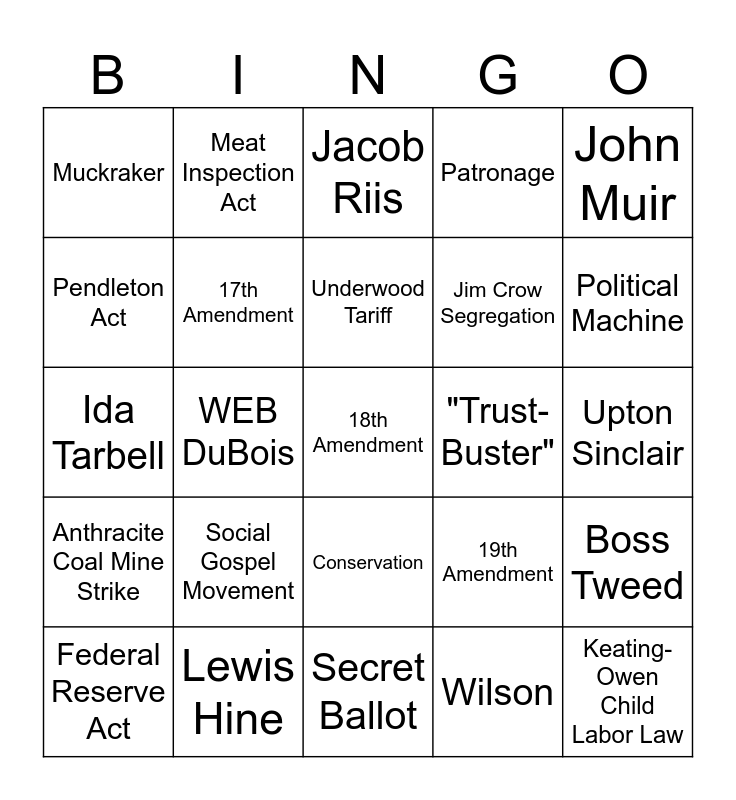 This bingo card has 30 words: Lewis Hine, 16th Amendment, WEB DuBois, Clayton Anti-Trust Act, Muckraker, Jacob Riis, 17th Amendment, Conservation, "Trust-Buster", Secret Ballot, Upton Sinclair, 18th Amendment, Wilson, Keating-Owen Child Labor Law, Political Machine, Ida Wells, 19th Amendment, Anthracite Coal Mine Strike, Social Gospel Movement, John Muir, Ida Tarbell, Tuskegee Institute, Meat Inspection Act, Jim Crow Segregation, Pendleton Act, Patronage, Boss Tweed, Federal Reserve Act, Underwood Tariff and Triple Wall of Privilege.